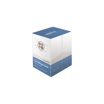 Bobina de 305 metros con 4 conductores de cobre trenzado calibre 20, aislamiento individual de FRPVC de alta calidad, cubierta exterior de PVC con protección anti-flama CM. Para aplicaciones de control de acceso